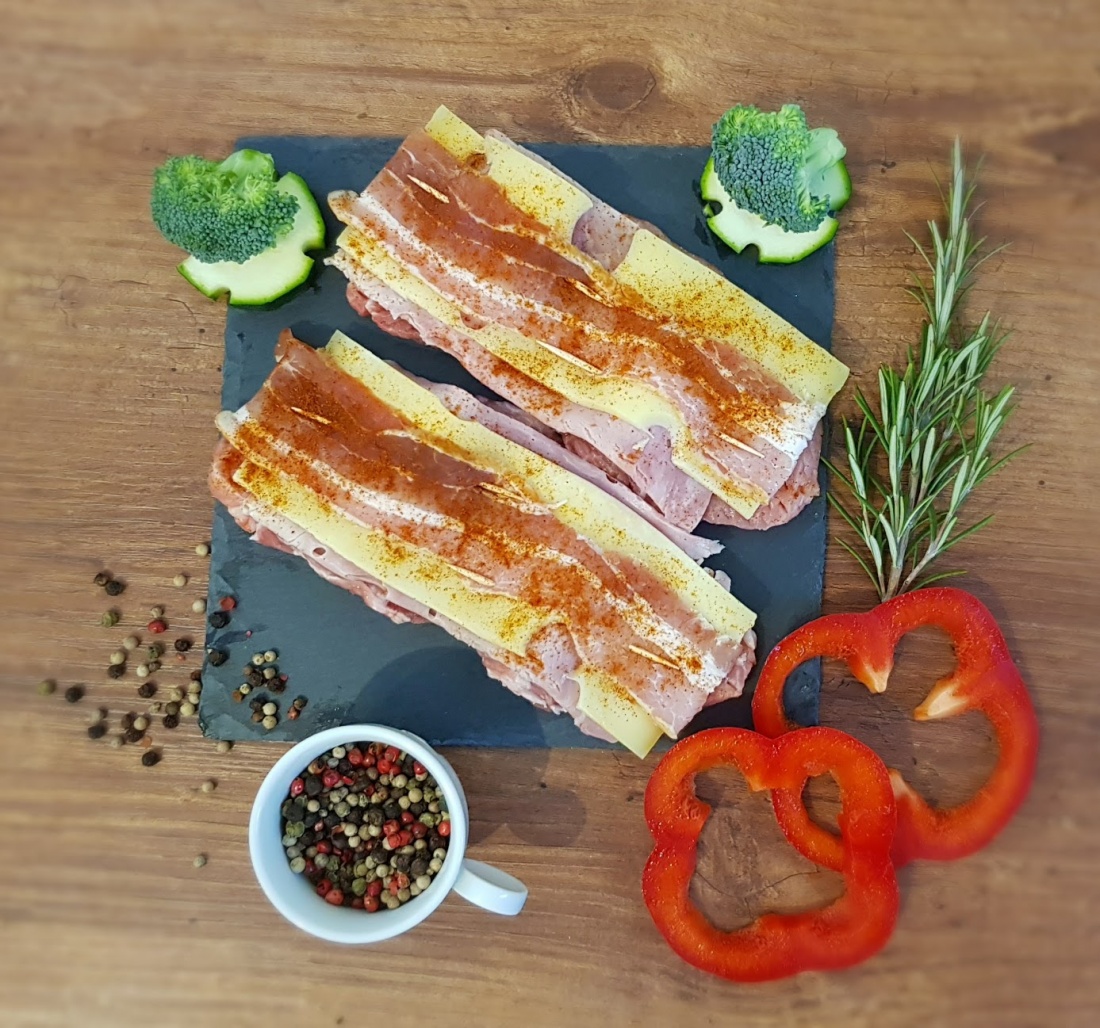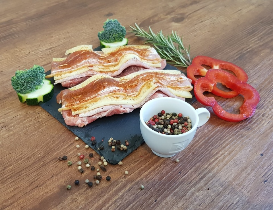 Aktion der Kalenderwoche 12 das Tigerschnitzel für 24 Fr./Kg statt 32 Fr./Kg. Saftiges Schweinshuftplätzli mit Schinken, Emmentalerkäse und Bratspeck.
