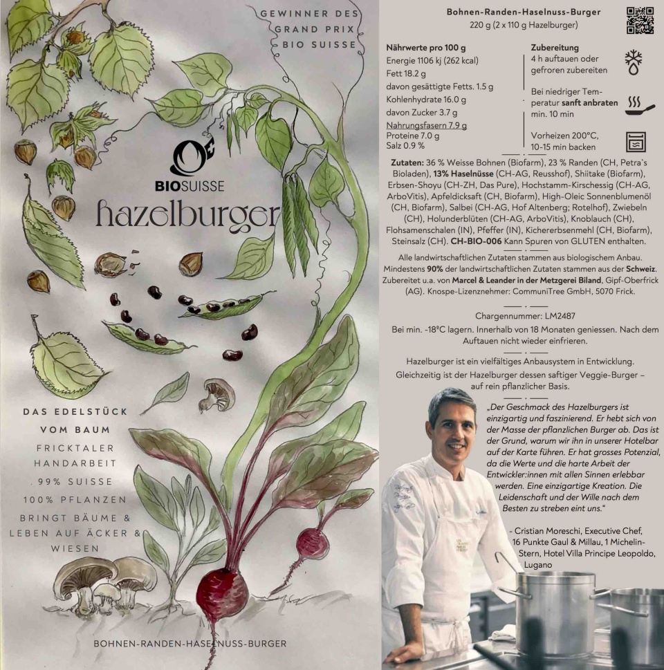 Im Hazelburger steckt pure Qualität aus unserer Region: Haselnüsse von veredelten Haselnussbäumen vom Reusshof (Niederwil AG) und bald aus dem Fricktal, Salbei vom Hof Altenberg und der Gartenberg Genossenschaft (Wölflinswil AG) und Hochstamm-Kirschessig und Holunderblüten der ArboVitis (Fricktal). Dank einer einzigartigen Zusammenarbeit wird der Hazelburger hier bei uns in der Metzgerei Biland zubereitet.